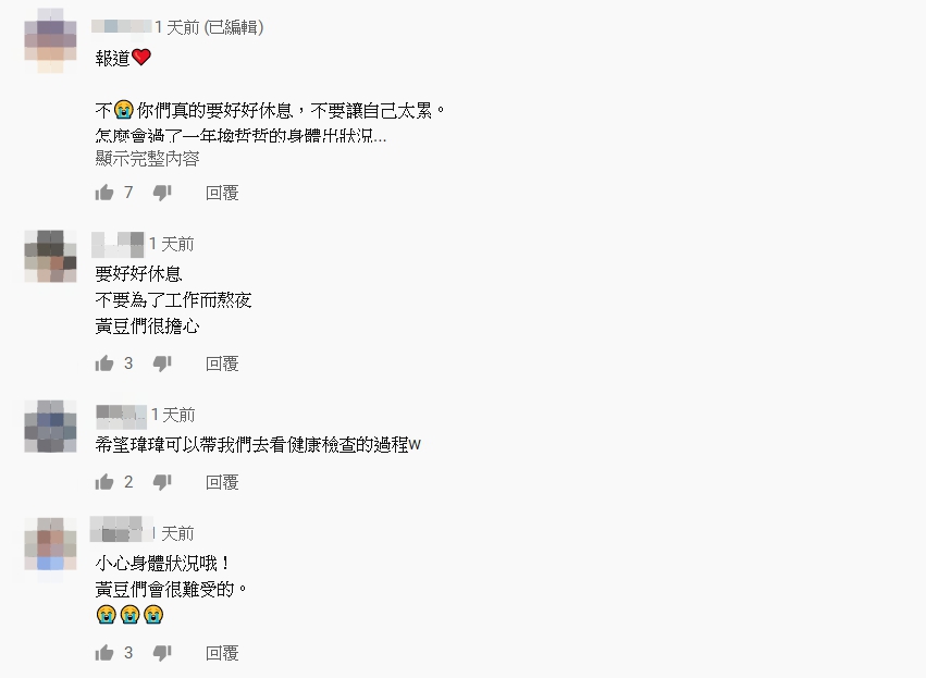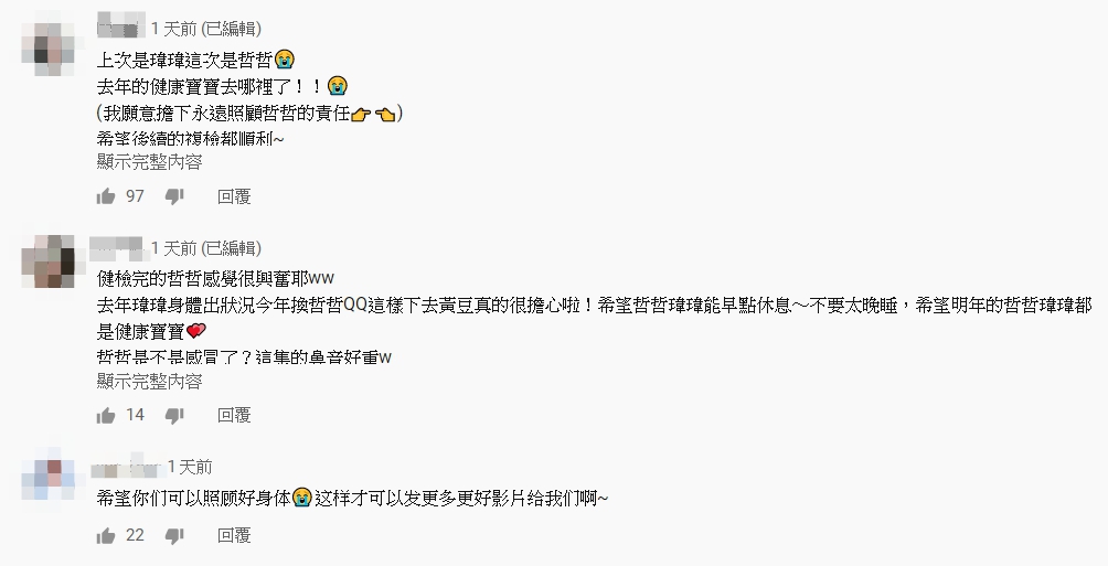 網友也紛紛在影片底下擔心留言,「要好好休息,不要為了工作而熬夜,黃豆們很擔心」「小心身體狀況哦!黃豆們會很難受的。」「怎麼又有異狀,兄弟倆要好好休息啊」「從弟弟有異狀變成哥哥有異狀⋯⋯」「上年是瑋瑋有事,這次連哲哲也有事了,嗚嗚,但幸好瑋瑋身體比上年好了很多,要好好休息啊!!!瑋瑋真的是一個超級好的弟弟」。