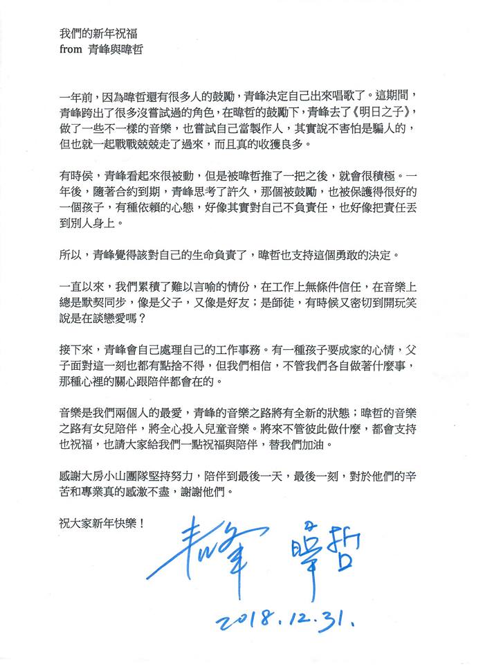 對此環球音樂也表示:「兩人已於去年12月31日結束合作,也發表過共同聲明,提告應是一場誤會,希望能趕緊把誤會釐清。」,更提到後續會再發完整的聲明。