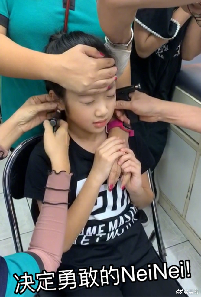 吳尊還在發文中曬出女兒打耳洞的現場照片,我們可以看到Nei Nei綁起馬尾,身穿黑色T恤,然後雙眼緊閉的坐在椅子上,似乎對於打耳洞這件事還是稍微感到害怕,不過一旁的媽媽伸出手讓她抓著,來讓她減緩那緊張的感覺!