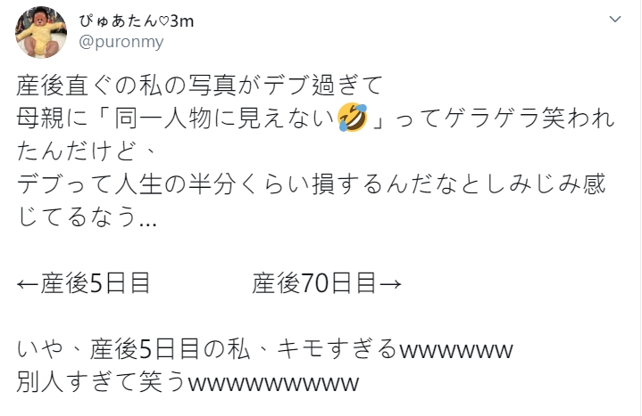 日本一名年輕的媽咪「puronmy」先前曾經在自己的推特上po文,表示自己剛生完寶寶的時候,看起來實在太胖了,就連自己的媽媽嘲笑自己:「跟之前比起來完全是不同人」。因為不想再被別人嘲笑「看起來很腫」的關係,這名媽媽開始下定決心減肥瘦身。並在推文中附上自己產後5天和產後70天的對比照,剛生完寶寶的她,穿著一套寬鬆的黃色洋裝,臉頰十分豐腴,手臂和肚子看起來也較為臃腫,因為肚子還沒有消下去的關係,她整個人都充滿了「媽媽味」,看起來充滿了福態。