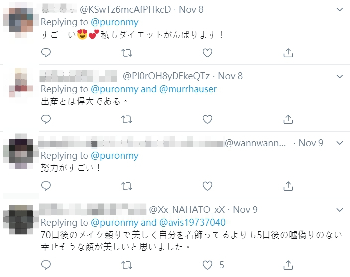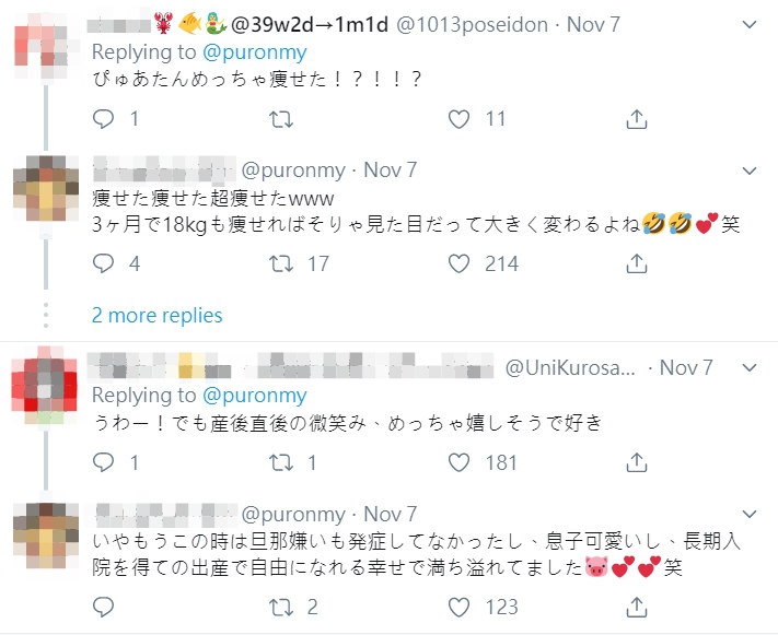「puronmy」表示,為了擺脫充滿「肉感」的身材,她決心開始減肥。她表示,自己在產後第41天開始會四處走動,除了日常的育兒之外,也會ˋ做一些簡單的家事。因為自己的母乳量少,她還會吃大量的蔬菜、菇類還有魚類,保持飲食均衡。除此之外,她還經常喝麥茶,並維持充足的睡眠。經過一系列的努力過後,她果然成功瘦了下來,並在推特上PO出自己產後70天之後,全家到神社參拜的照片。成功瘦身後的她,手臂變細,肚子也跟著消失,整個人明顯瘦了一大圈, 因為「臉頰消風」的關係,甚至連眼睛都變大,五官也變得更加立體,和當初產後5天的模樣完全判若兩人,更成功把BMI指數28降到20,達到健康範圍。如今身形縮小了一圈的她,看起來充滿了自信和魅力,也讓她忍不住表示:「胖的人真的好吃虧」。