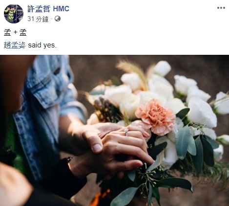 藝人許孟哲和張艾亞在前年宣布分手,斷了4年的感情,萬萬沒想到許孟哲在14日竟向凱渥女模趙孟姿求婚成功!讓他喜悅的在臉書發文表示,「孟+孟!趙孟姿said yes!」,還附上女友被戒指套牢的照片,讓網友們看完都羨煞不已!