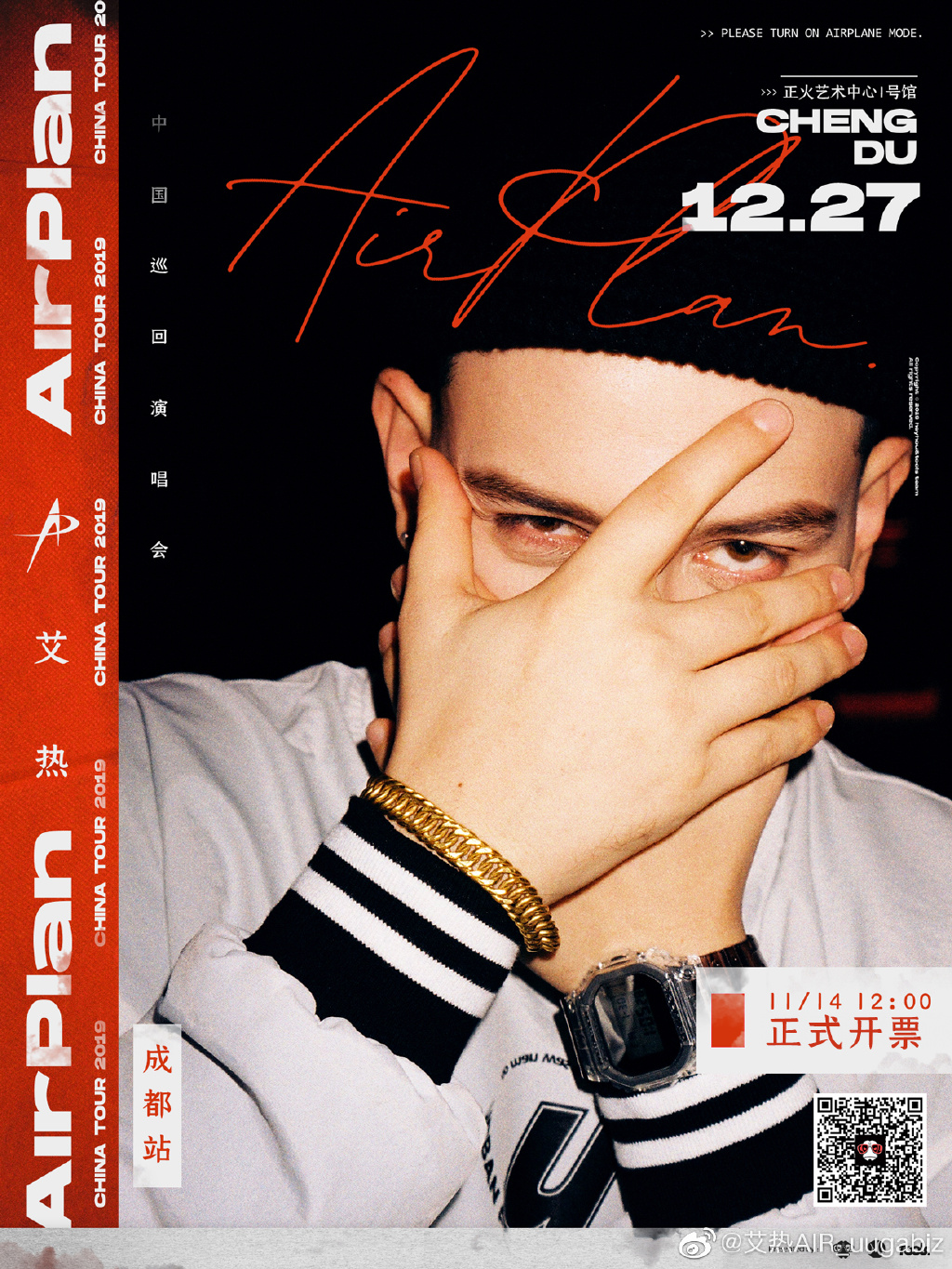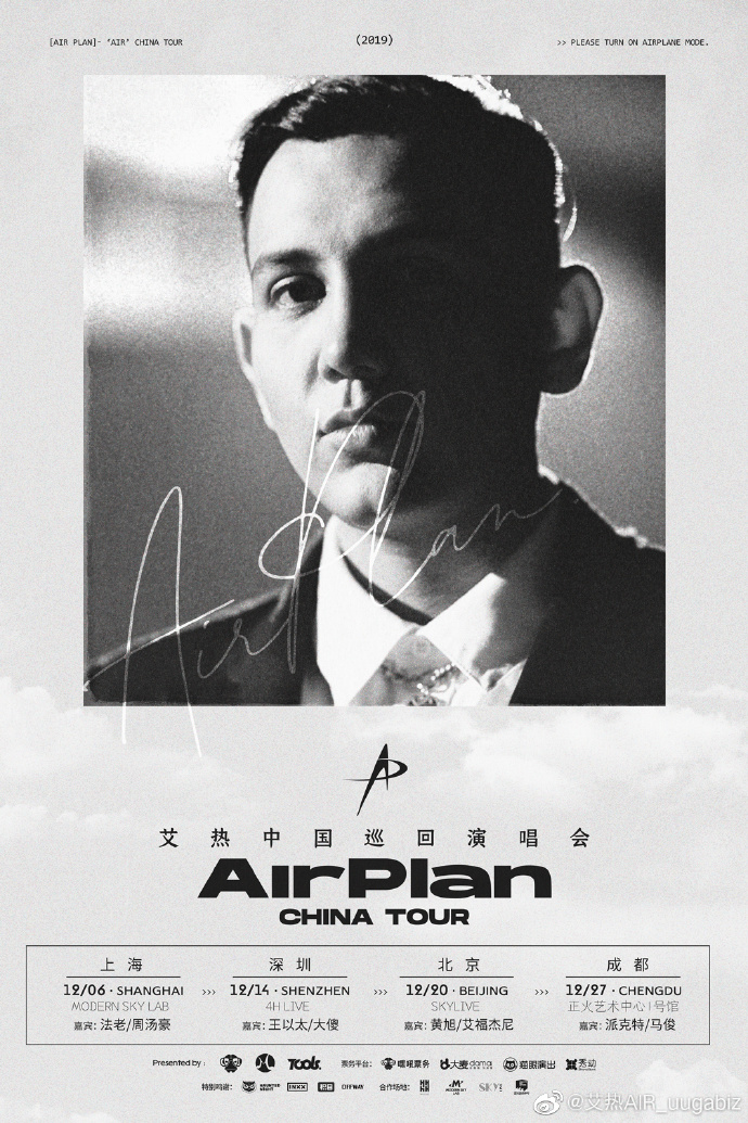 除此之外,《Air Plan》演唱會之後依序在北京、深圳和成都舉辦,每場都會邀請兩位重量級來賓,包含了王以太、大傻、黃旭、艾芙結尼、派克特和馬俊,每位都是現階段在中國嘻哈圈重量級歌手。艾熱也在個人微博對於這次的演唱會表示,「一場全新的專輯、一支期望的樂隊、一場音樂的飛行、一個蛻變的計畫,我的首次個人巡演《Air Plan》即將起航蓄力已久的音樂飛行計劃終於來了!!!」,演唱會將在今日中午12點正式開賣。