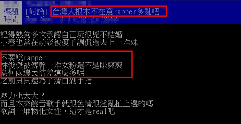有位網友標題以「台灣人根本不在意rapper有多亂吧」在網路討論版上,他提出問題表示:「記得熱狗多次承認自己玩很兇不結婚 小春也常在訪談被瘦子調侃過去上一堆妹 不要說rapper 林俊傑被傳幹一堆女粉還不是賺爽爽 為何兩邊民情差這麼多呢 之前貝貝還為了清白剁手指 壓力也太大? 而且本來饒舌歌手就跟色情跟淫亂扯上邊的嗎 歌詞一堆物化女性,這才是real吧」,直指台灣人跟中國兩邊根本兩樣情,同樣都是出現桃色風波,但是林俊傑出過這麼多風波卻還是在歌壇上屹立不搖,也有不少鐵粉依舊支持,反之PG One在中國卻是慘遭封殺的命運,兩人的待遇相差甚遠。