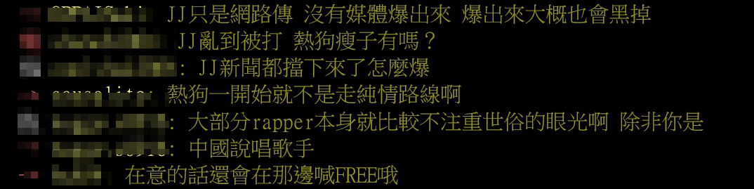 這個問題也讓許多網民們前來解答:「JJ只是網路傳 沒有媒體爆出來 爆出來大概也會黑掉」、「JJ亂到被打 熱狗瘦子有嗎?」、「JJ新聞都擋下來了怎麼爆」、「熱狗一開始就不是走純情路線啊」、「大部分rapper本身就比較不注重世俗的眼光啊 除非你是中國說唱歌手」,更有人表示:「O大嫂到哪都是江湖大忌,你是不知道還是在裝逼」。