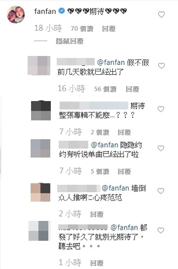 但也有其他網友看到范范被罵之後,紛紛留言表示,「牆倒眾人推啊!心疼范范」、「她期待整張專輯,不能嗎?」、「就別在這吵架了,還給丞琳一片淨土吧!」。後來沒多久留言就消失在貼文中,不知是否是被范范刪除還是被粉絲檢舉到不見了。