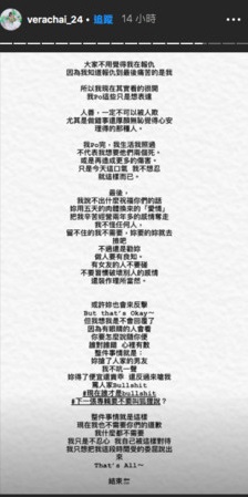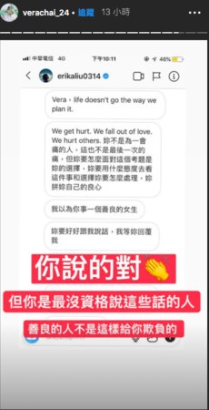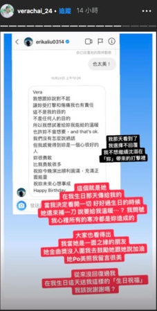 後來Vera決定要看開,不再去多想,沒想到卻在上個月24日她生日當天,收到了劉艾立的訊息,內容寫道,「我想跟妳說聲對不起,讓妳受到打擊和傷痛,我也有責任!這不是我的目的,不是任何人的目的,所以我想試著給妳我能給予的溫暖,也許妳不會想要,and that's ok,你很勇敢,比我勇敢很多!」