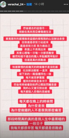 Vera在限動中發了好多篇貼文來表示自己的委屈,她寫道,「交往兩年男友呂孝廷,因參加寫歌創作營跟劉艾立搭上線,後來還睡在一起,劉艾立還一直PO文來刺激她!讓她『心碎到極點!』」從知道男友偷吃之後,Vera每天都吃不下也睡不著,「每天都從惡夢中驚醒,只要看到他們公開放閃,我的心又會沉到谷底!」