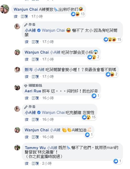 不少網友在貼文下方留言表示,「A辣要放鳥出來嚇他們」、「放老鷹出來」,對此小A辣則坦言,目前「嚇不了,太小」,同時透露自己正在吃荷爾蒙的關係,因此男性特徵萎縮變成「小蟲」,正在變性當中!小A辣也在留言中提到,一年後才是「真正的女生」,疑似預告一年後將進行手術,而網友們也紛紛送上祝福。