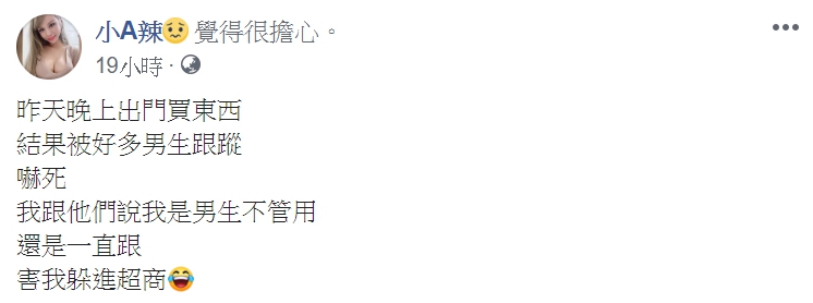 日前小A辣在她的臉書粉絲專頁上PO文,透露自己昨天晚上出門買東西,卻被一大群男生跟蹤,讓她十分地驚恐,她提到「我跟他們說我是男生不管用,還是一直跟」,最後不得已躲進超商,才結束這場跟蹤風波。文章一出,小A辣立刻收到不少網友關心,然而也有許多人提議可以用「男性特徵」來嚇退對方,小A辣對此也悄悄透露未來「變性」計畫。