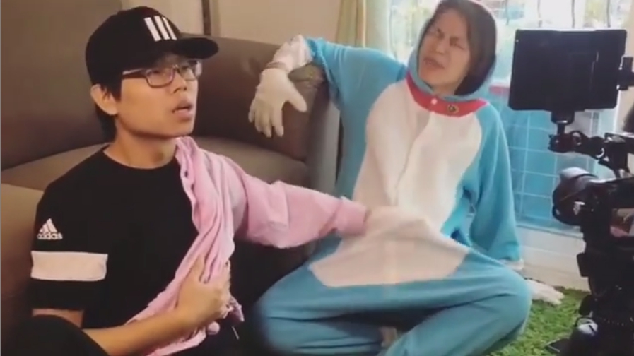 「HowHow」日前在Instagram上傳影片花絮,從中可以看到,HowHow穿著多啦A夢布偶裝,而藍亦明為了劇本內容,面無表情地伸出手,在布偶裝裡的百寶袋不斷掏阿掏,由於位置尷尬,加上HowHow浮誇神情,令人不禁想歪,多啦A夢也因此大崩壞!