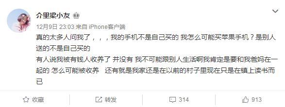 不過梁小友曾經針對自己使用iPhone一事在微博上澄清,「真的太多人問我了,我的手機不是自己買的。我怎麼可能買蘋果手機?是別人送的不是自己買的。」對於「被有錢人收養」傳聞,她也聲明「並沒有,我不可能跟別人生活啊!我肯定是要和我爸媽在一起的,怎麼可能被收養。」同時說明她的家還是在以前的農村裡只是現在在鎮上讀書,但對抽菸傳言沒有任何回應。