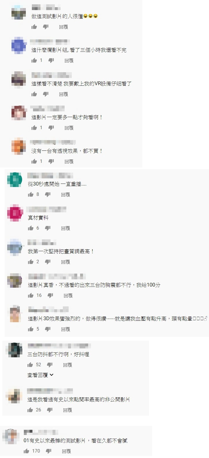 許多網友都開玩笑表示:「做這測試影片的人很懂」、「這什麼爛影片,看了三個小時我還看不完」、「這樣看不清楚 我要戴上我的VR設備仔細看了」、「這影片一定要多一點才夠看啊!」、「沒有一台有透視效果,都不買!」、「從30秒開始 一直直播...」、「真材實料」、「我第一次堅持把畫質調到最高!」、「這影片真香,不過看的出來三台防胸震都不行,我給100分」、「這影片3D效果蠻強烈的,做得很讚⋯⋯就是讓我血壓有點升高,頭有點暈」、「這個是我看過有史以來點閱率最高的非公開影片」、「看在久都不會膩」。