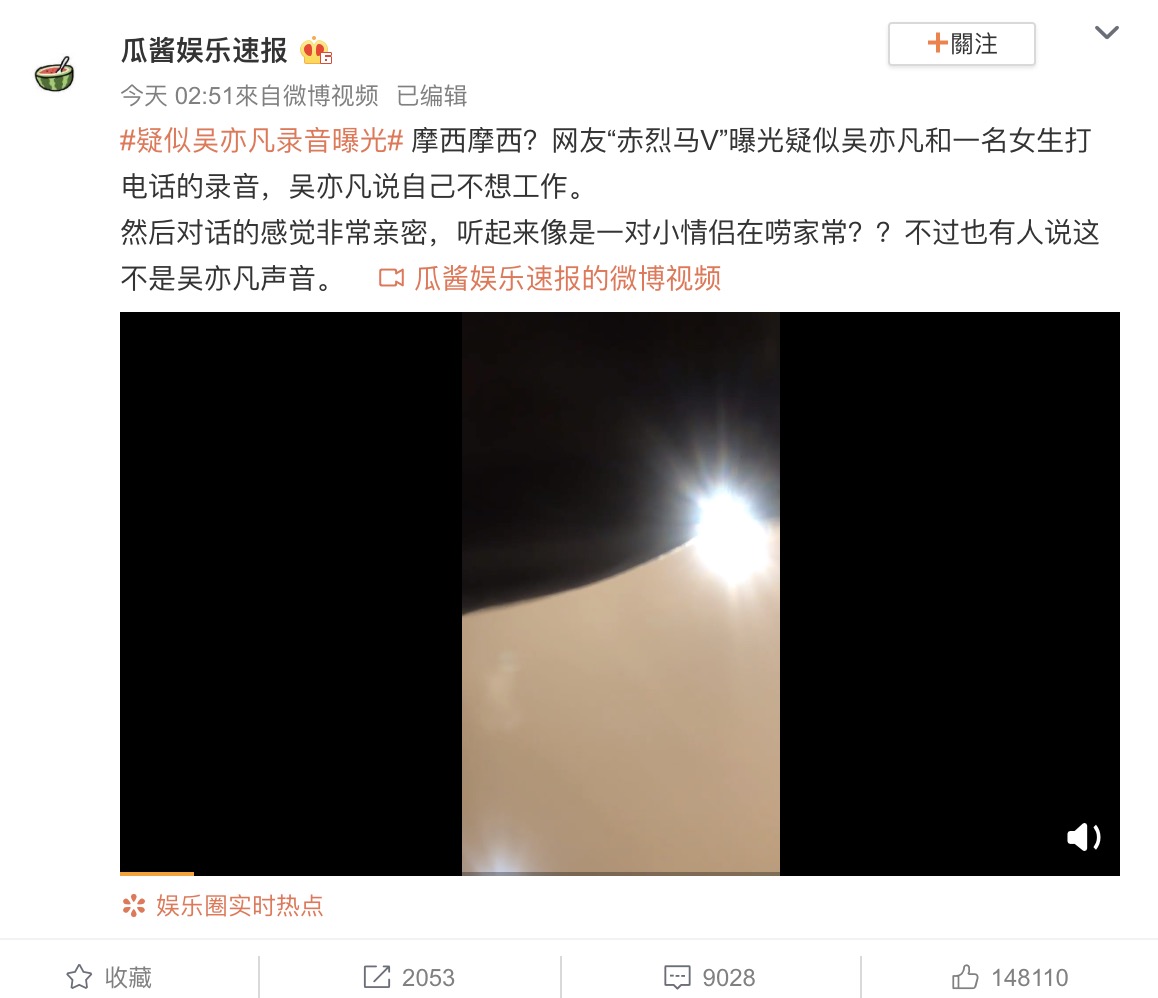 大陸人氣男星「吳亦凡」於2012年時在韓國以EXO成員之姿出道,但在2014年時就退出團體轉戰大陸演藝圈,是一位能演戲也能唱歌的全方位藝人,近期更接續擔任《中國新說唱》第二季的導師。在今年9月初時,吳亦凡被大陸媒體拍到和一名相差9歲的女演員「秦牛正威」(綽號:鹿依Luna)十指緊扣,並且帶回家過夜,戀情疑似被曝光,但隨後卻被爆出認愛前一週正在和其他女性約X,在今日(18)吳亦凡又被爆出與一名女子的語音對話,在談話間兩人就像情侶般親密,再度引起熱議。