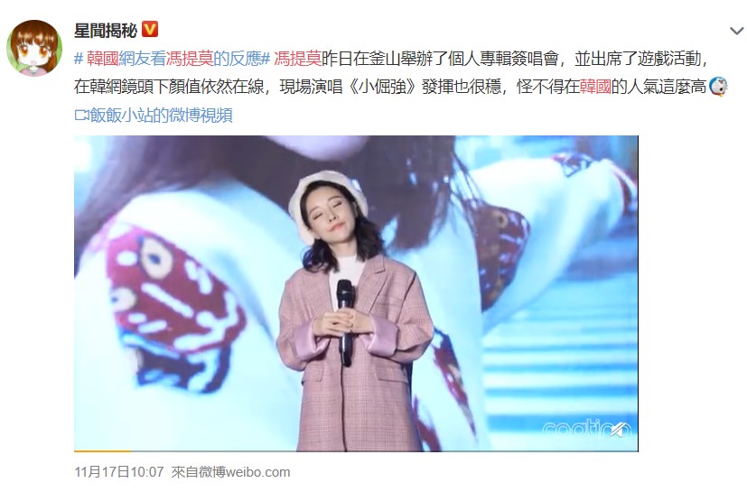 中國人氣直播主馮提莫,以亮麗的外型和清甜的歌聲,同時擁有膾炙人口歌曲《佛系少女》、《哼》、《元氣滿滿》等,在大陸鬥魚直播平台獲得了超高人氣,更被網友稱為「華人第一網紅」。日前馮提莫與鬥魚直播平台的5年合約即將期滿,將會在平台上停播。近日馮提莫前往韓國釜山舉辦專輯簽售會,在韓國當地高人氣的情況在微博上轉發,立刻引起了網友們熱議。