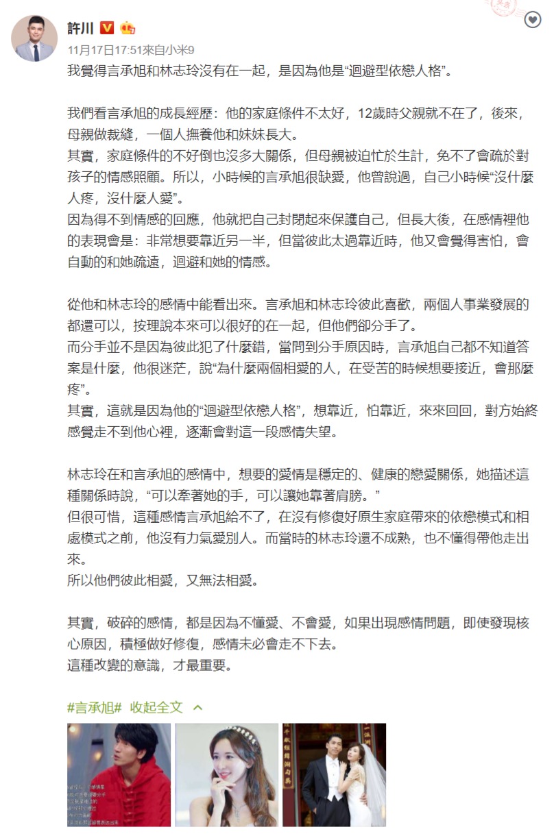 最後許川也指出,林志玲要的是愛情的穩定,健康的戀愛關係,她曾說過希望「能牽著他的手,讓他可以靠著肩膀!」可是這些是言承旭給不了的,許川更感嘆的說,「在還沒修復好原生家庭帶來的依戀模式和相處模式之前,他沒有力氣愛別人!當時的林志玲也還不成熟,不懂得帶他走出來,所以他們彼此相愛,卻又無法相愛!」徐川在最後給予忠告說,「若出現感情問題,即使發現核心原因,積極做好修復,感情也未必會走不下去,這種改變意識,才最重要。」