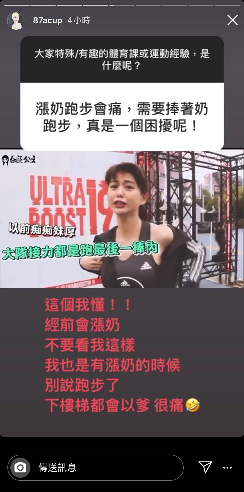 日前白癡公主在自己的instagram與網友互動,以「大家特殊/有趣的體育課或運動經驗,是什麼呢?」為題,開放粉絲提問,有網友提到「漲奶跑步會痛,需要捧著奶跑步,真是一個困擾呢!」她則回答,「這個我懂!經前會漲奶,不要看我這樣,我也是有漲奶的時候,別說跑步了,下樓梯都會以爹,很痛。」回答同時附上過去拍攝影片內容,曝光自己胸前其實也很「ㄉㄨㄞ」!