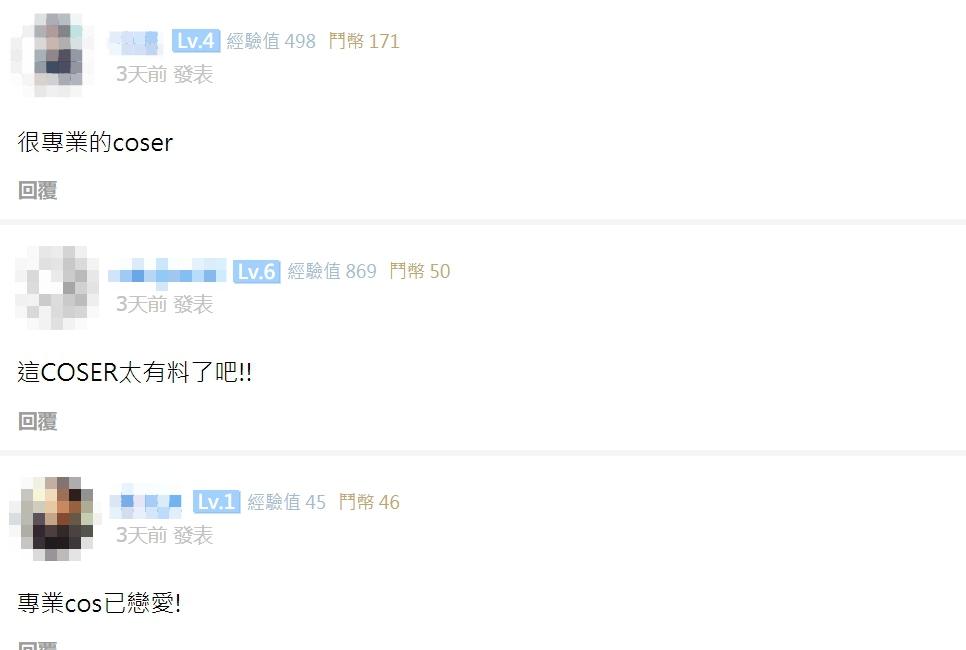 網友也紛紛留言大讚,「這個真的讓人受不了啊!」、「這圖修的超美的XD」、「很專業的coser」、「這COSER太有料了吧!!」、「專業cos已戀愛!」。