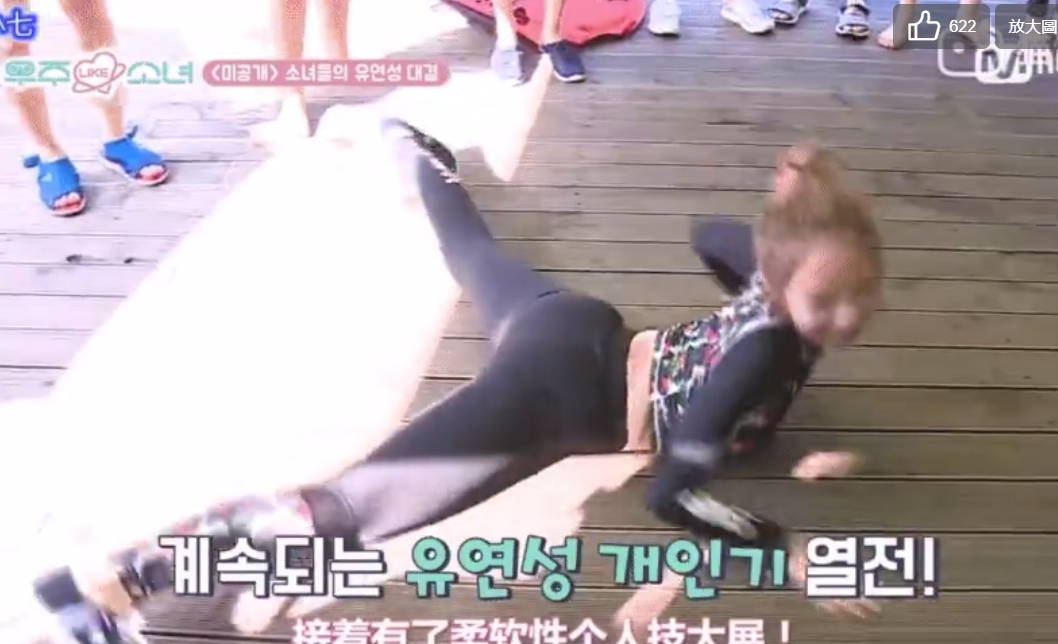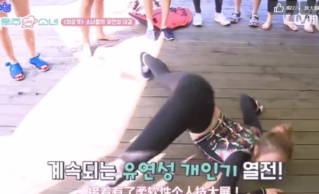 從小學舞的孟美岐,過去在「宇宙少女」團內便擔任團體副唱以及主舞,從小的舞蹈底子給她打下扎實的基礎。最近網路上流傳一則GIF動圖,內容是孟美岐過去在「宇宙少女」團體綜藝《宇宙LIKE少女》的片段內容,她趴在地上,兩腿伸直,臀部抬高,上身微彎,整個身體呈現「N字型」後,快速從地上爬起來,身體柔韌性相當令人驚嘆。