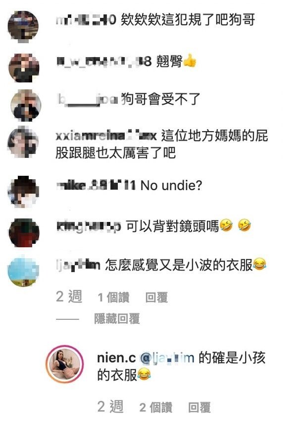 照片一出之後,立刻引起網友們圍觀,大家紛紛直呼:「太辣了!」、「超級性感!!」、「狗哥會受不了」,也有網友發現,這件似乎是女兒的衣服更留言詢問「怎麼感覺又是小波的衣服」,鄭年均也大方回應:「的確是小孩的衣服」,接著更有眼尖的網友抓包鄭年均疑似沒有穿內褲,火辣指數爆棚。