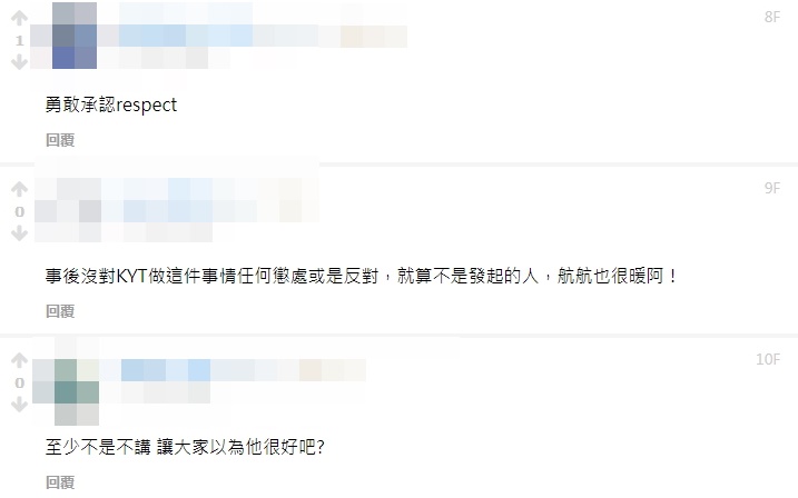 統神澄清事件真相後,直播畫面也被剪輯成精華分享到「遊戲大亂鬪」平台,不少網友紛紛留言表示,「真是拉風的男人,沒有就直說沒有,不會裝有來分一杯羹」、「拉風的男人就是不會想去分一杯羹,做自己最棒」、「事後沒對KYT做這件事情任何懲處或是反對,就算不是發起的人,航航也很暖阿!」、「勇敢承認respect」。