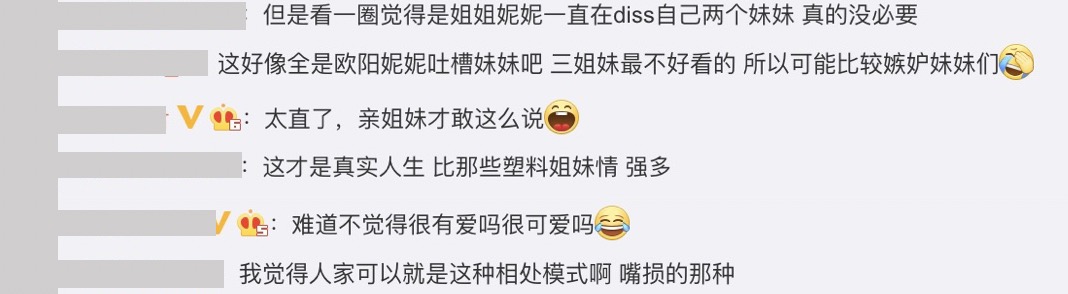 看見這些對話後,許多網友認為是妮妮很愛嫌棄和diss妹妹,而另一派網友則認為這才是真實的姐妹情,日常互相打鬧吐槽都是很正常的事情,不需要這麼大驚小怪,三人的情誼再度引起兩極的討論。