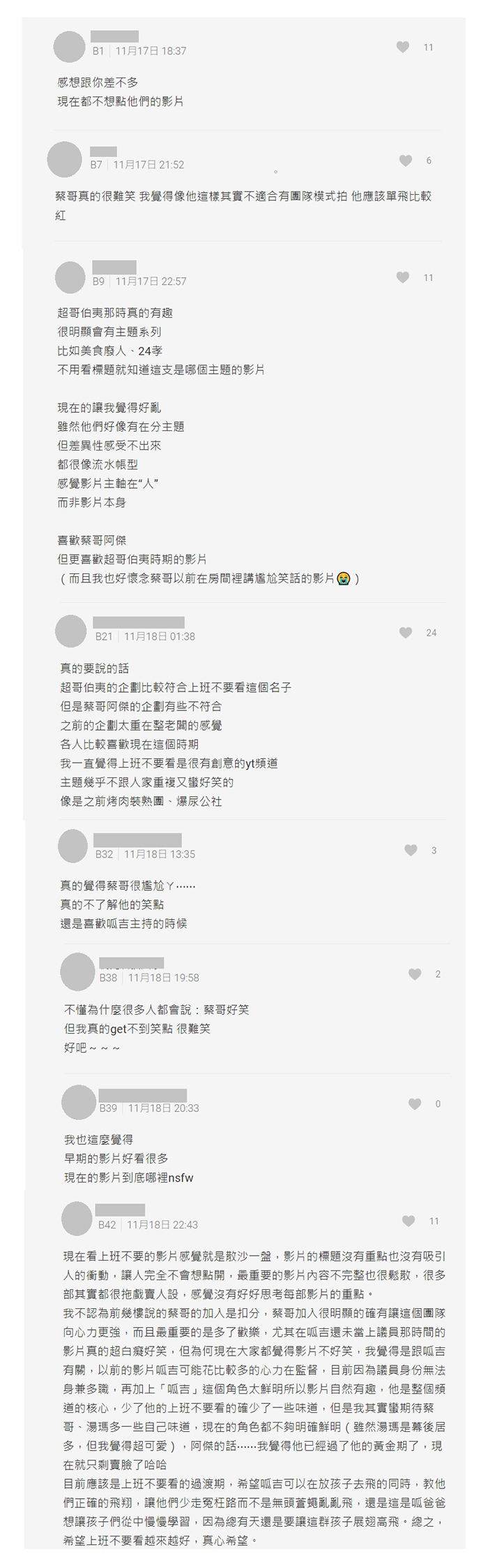 近期,針對「上班不要看」影片內容變差、企畫尷尬等話題的討論,一直在PTT版上熱烈地進行著。而近日,又有一名網友在Dcard發文「上班不要看是不是越來越難看了」,該名網友在文中表示過去「超哥伯夷」還在團隊時的影片企畫內容都十分有梗,而且老闆呱吉也很有趣、好笑,然而隨著呱吉選上議員,「超哥伯夷」離開團隊,換「蔡哥阿傑」主導後,影片內容就不再有趣,原PO更直言「真的是看不太下去了」,最後感嘆地大呼「呱吉快回來吧」,言語間充滿著對「上班不要看」的失望。