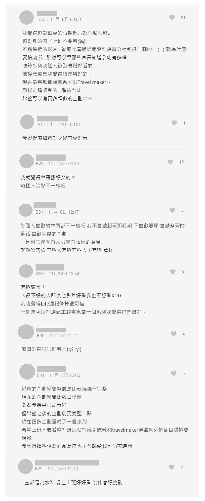 貼文一出,也吸引了許多「上班不要看」的觀眾出面作出回應,有不少人十分認同原PO的看法,大呼「get不到蔡哥的笑點,很難笑」「蔡哥真的很難笑」「真的覺得蔡哥很尷尬啊」「阿傑的話,我覺得他已經過了他的黃金期了,現在就只剩賣臉了」,網友們大多認為蔡哥和阿傑的企畫已經脫離了「上班不要看」的概念了,而且拍攝影片的主題內容也較為混亂。
