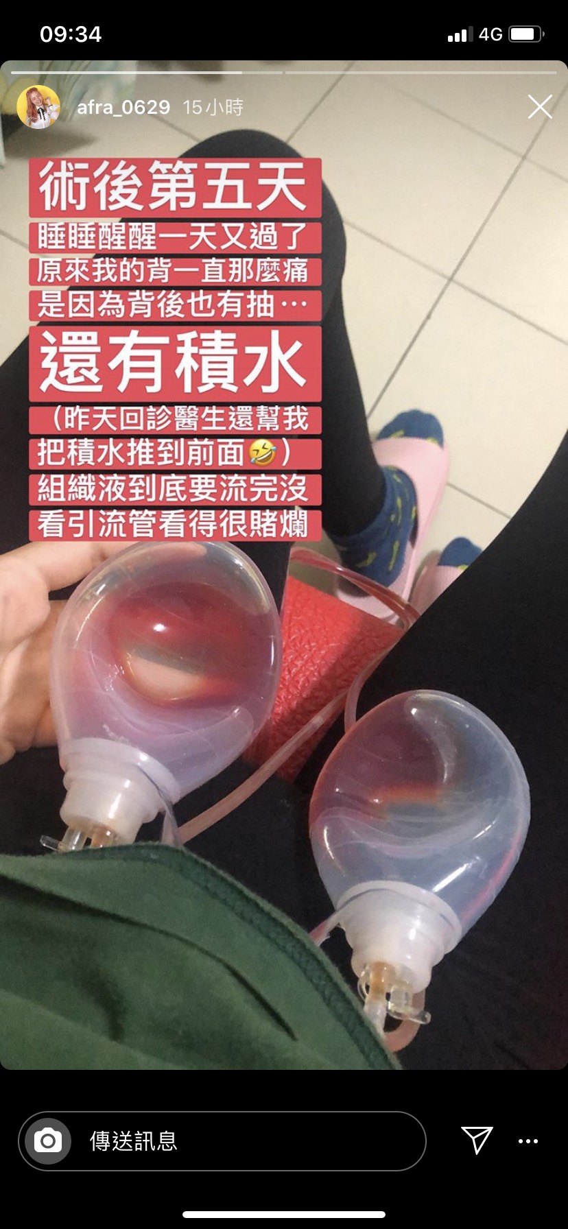 「超直白」在術後第五天時,也曾分享過她的恢復進度,當時她貼出帶著引流管的照片表示,「組織液到底要流完沒,看了感覺很賭爛。」此外,「超直白」也曾貼出術後腫照,她表示當時是腿最腫的時期,期待自己消腫的模樣。而網友們除了關心她的術後恢復進度以外,也對她完整恢復之後的模樣十分期待。