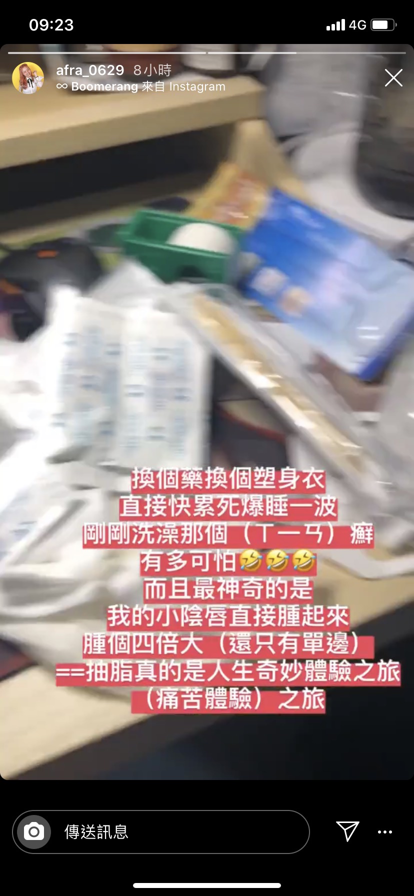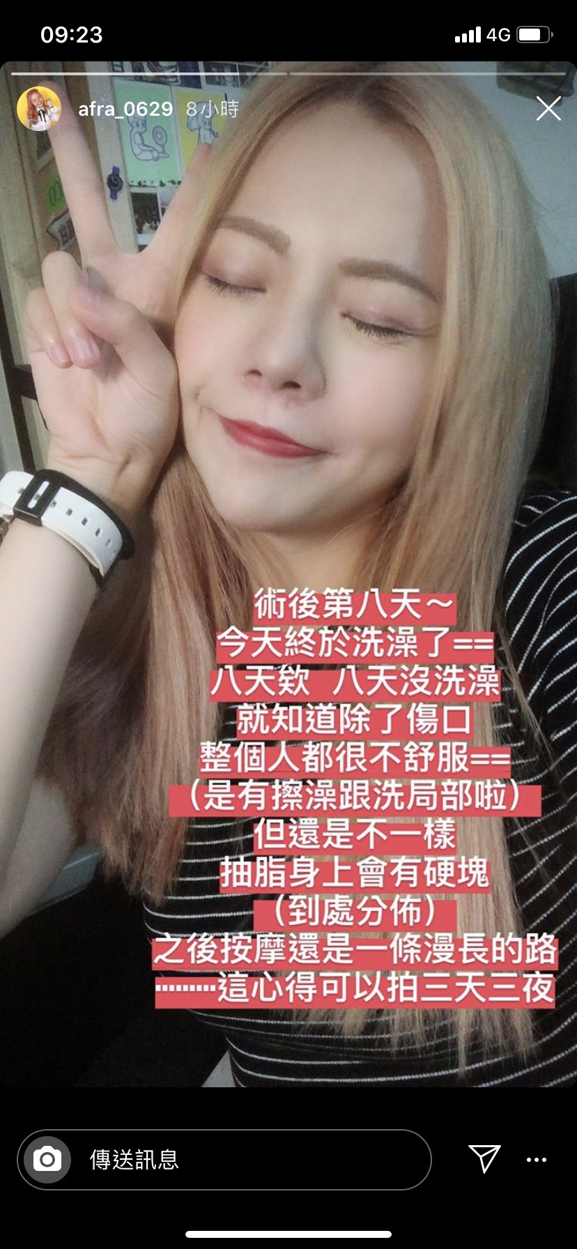 日前她在限時動態上分享自己的術後近況,開心表示經過了八天終於可以洗澡!她也透露自己因為許久沒洗澡,整個人渾身不舒服,同時爆料自己沒洗澡而長癬,「最神奇的是單邊小陰唇甚至腫起來,腫個四倍大」!而自體隆乳的術後恢復,也讓「超直白」直呼是痛苦體驗之旅,她提到因為抽脂的關係,身上會到處布滿硬塊,之後按摩復健還是一條漫長的路,各種心得一湧而出,而說不完的內心話也讓「超直白」大嘆可以講個三天三夜!