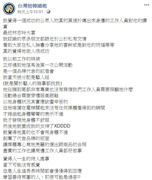 知名部落客台灣妞韓國媳於17日在粉專發文讚賞「林志玲」,文中寫道,自己曾和林志玲有一面之緣,當時她落馬後,在復出的第一場公開活動中,台灣妞韓國媳也受邀參與活動,當天關於藝人碰到的所有雜事,都是屬於她的工作範圍內,而林志玲也在公開品牌代言活動中,保持著高度的專業,就算身上還帶著傷,還是全程都穿著禮服和高跟鞋,完全沒有要麻煩工作人員來照顧她的意思。