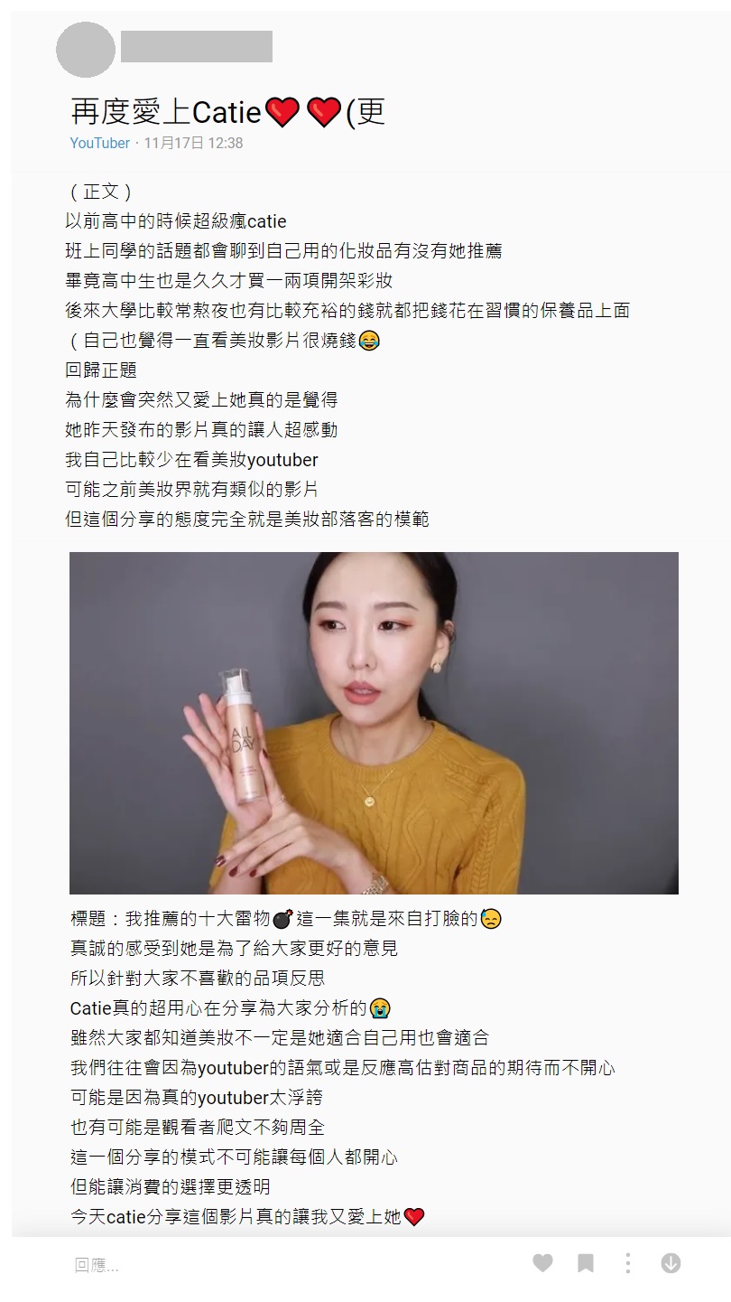 然而,近日卻有一名網友在Dcard上PO文直言「再度愛上Catie」,其最要的原因是「Catie」最近上傳了一支名為「我推薦的十大雷物,這一集就是來自打臉」的影片,影片中她針對自己過去所推薦的美妝產品做出反思,並做進一步地給予分析和解釋,這也讓原PO大呼「這個分享的態度完全就是美妝部落客的模範」,同時原PO也被Catie的新影片感動不已。