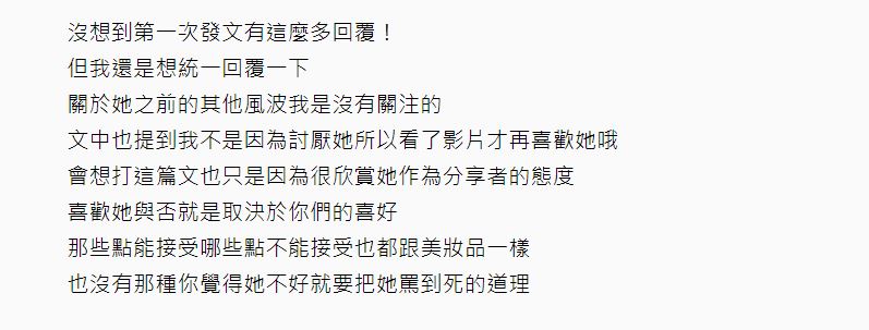 除此之外,原PO也針對有許多網友所提及的「Catie」爭議事件作出回應,她透露「會想打這篇文也只是因為很欣賞她作為分享者的態度,喜歡她與否就是取決於你們的喜好」,直言實在沒有必要因為討厭「Catie」就要把她往死裡罵,畢竟每個人都有自己喜歡和不喜歡的人事物。