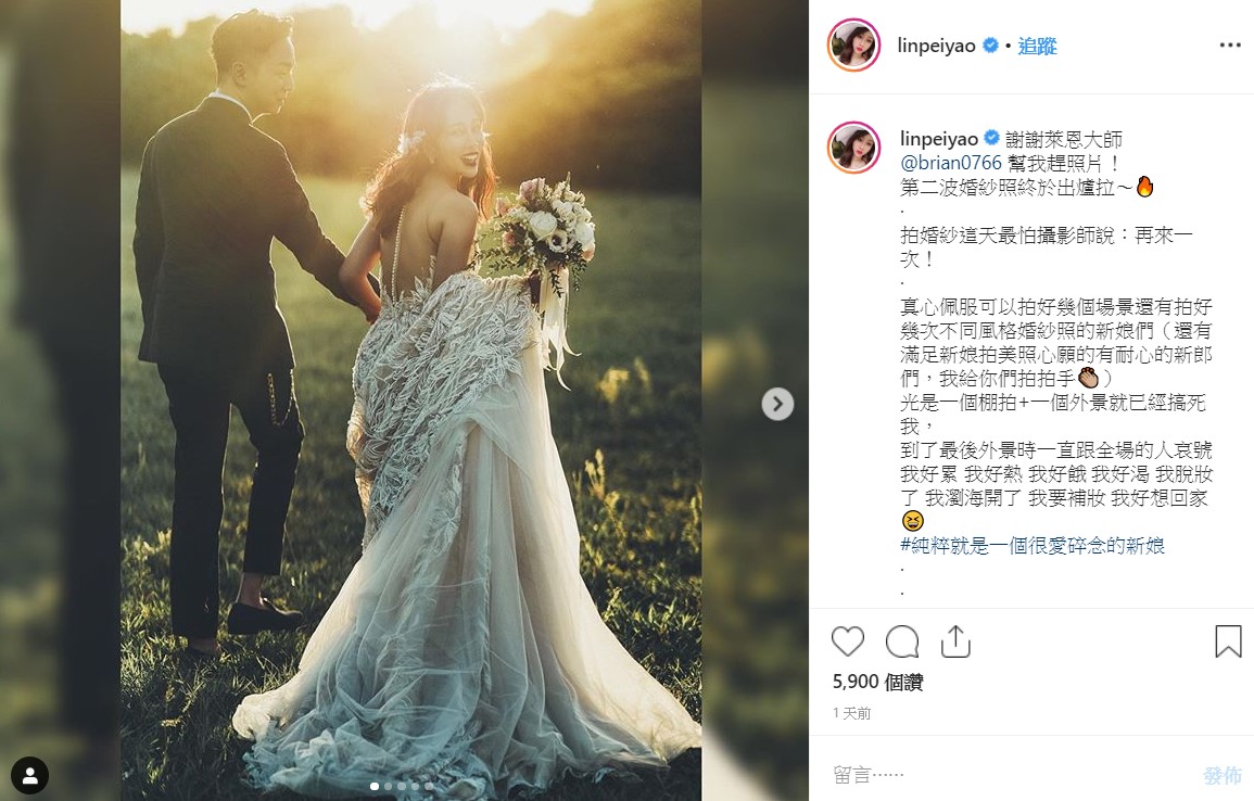 參加《超級星光大道》而爆紅的林佩瑤,因為原本的職業,被網友們封為「最美空姐」,即便後來在演藝圈沒有太多的發展,也依然擁有許多忠心的鐵粉~而她也在今年7月時,跟名廚武俊傑陷入熱戀,沒想到交往不到半年,突然就大方宣布兩人將在年底結婚!林佩瑤最近還大方的在個人IG曬出第二波婚紗照,讓網友們看完都紛紛留言表示,「乾!美到炸!那個透視好厲害!」