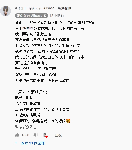 Youtuber「愛莉莎莎」曾在韓國留學一年,2018年回台後成為全職Youtuber,以拍攝韓國流行事物為主題,包含穿搭、美妝、美食等情報,另外也有許多其他單元,目前有頻道訂閱人數超過80萬,人氣十分地高。日前她獲得Netflix記者會10分鐘的採訪機會,面對6位韓國巨星,竟犯下超失禮的錯誤!