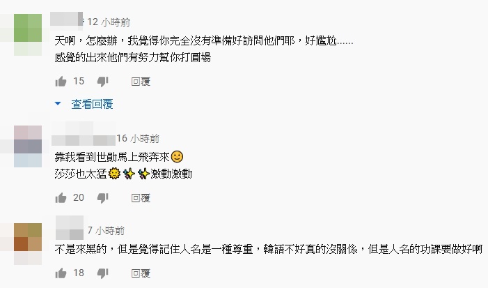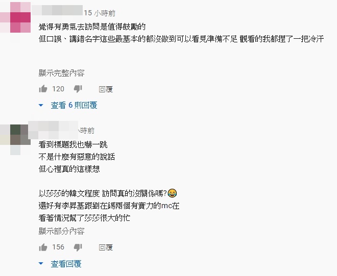 愛莉莎莎影片一出,立刻引起廣大迴響,有人認同愛莉莎莎的努力,同時也能感同身受採訪的緊張感。不過也有許多人留言表示,「覺得有勇氣去訪問是值得鼓勵的。但口誤、講錯名字這些最基本的都沒做到,可以看見準備不足,觀看的我都捏了一把冷汗」、「天啊,怎麼辦,我覺得你完全沒有準備好訪問他們耶,好尷尬......感覺的出來他們有努力幫你打圓場」、「不是來黑的,但是覺得記住人名是一種尊重,韓語不好真的沒關係,但是人名的功課要做好啊」。