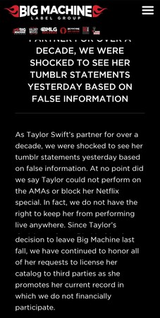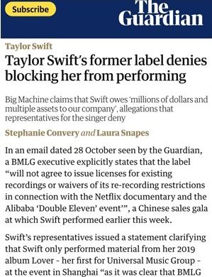 雖然大機器唱片隨即發出聲明,否認禁唱泰勒絲演唱自己的歌曲,不過美國多家報社也出面指稱,表示握有泰勒絲團隊所提供的證據,證實大機器唱片確實不讓泰勒絲唱自己的舊歌,引發粉絲不滿。最後大機器唱片終於決定讓步,授權讓泰勒絲在全美音樂獎上,可以演唱自己出道多年所發行的歌曲。
