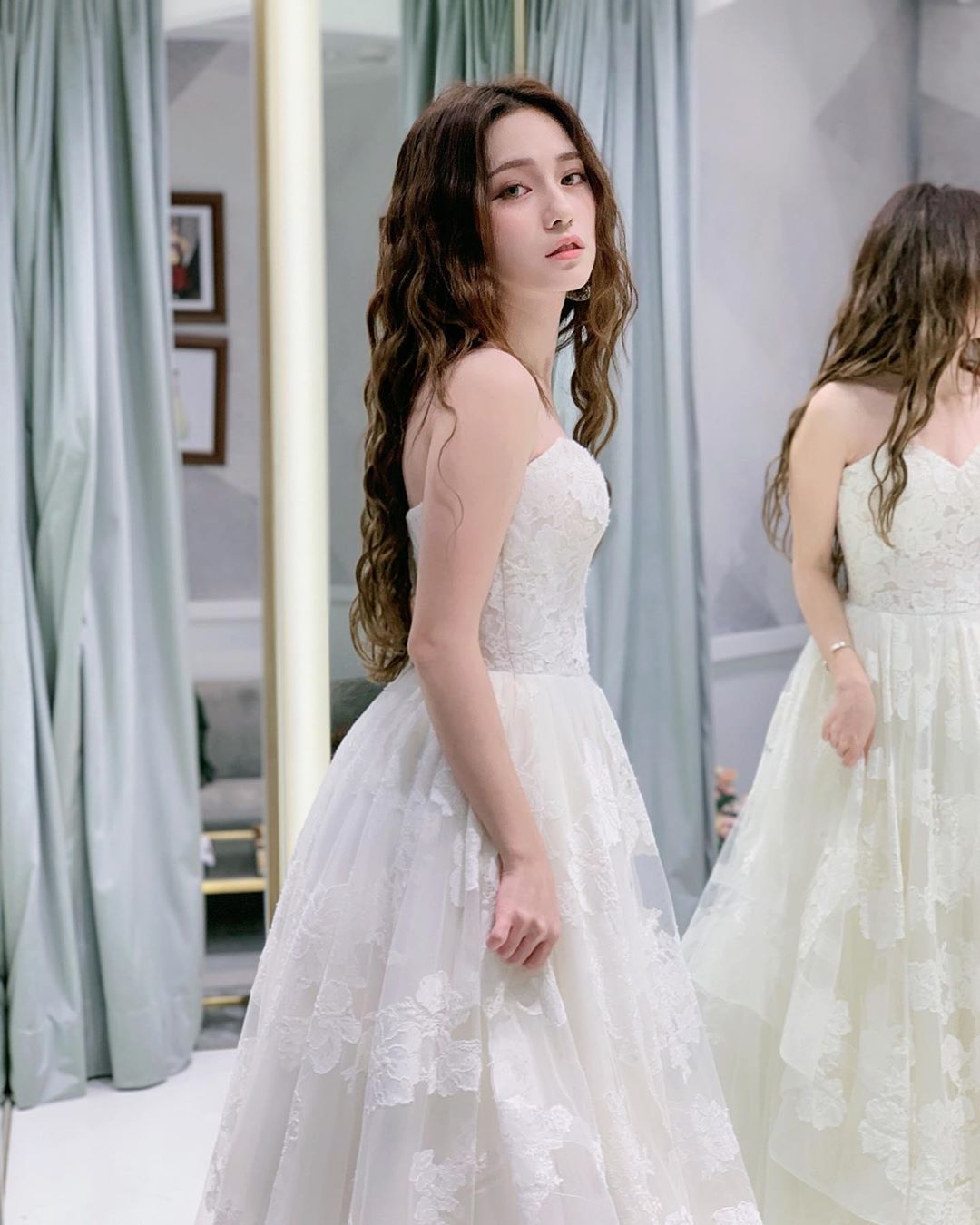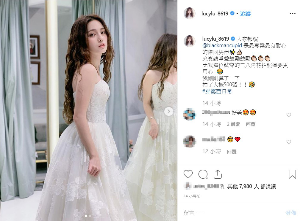 近日Lucy在IG驚喜曬出婚紗照,從照片中可以看到,Lucy穿著一襲雪白色婚紗,上半身小露出若隱若現的事業線,平口設計讓性感的鎖骨和雪白雙肩完全展現,頭髮造型則是弄成波浪捲,營造出靈動少女的氣質,十分美麗動人。Lucy貼出照片時,同時也配上文字表示「黑男是最專業最有耐心的陪同男伴」,並直言自己在婚紗店拍了大約500張照片。男友「黑男」也在底下大力稱讚「太美了」配上愛心符號,並且在個人IG上曬出另一組Lucy婚紗照,配上文字「露西小公主」,瞬間閃瞎不少人。