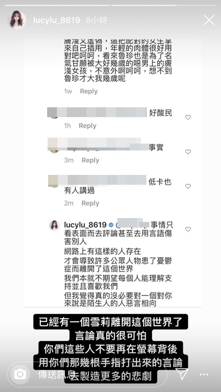 兩人感情雖然十分穩定,但是因為年齡差距,因此也慘遭不少酸民批評,日前曾有酸民對於兩人的戀情口出惡言,直言表示黑男拍片是為了自肥,同時以「年輕的肉體很好用吧呵呵」嘲諷。隨後Lucy與黑男兩人分別對酸民們給予反擊,並且呼籲沒必要對一個陌生人相向,感嘆表示「言論真的很可怕,不要再製造更多悲劇」.。