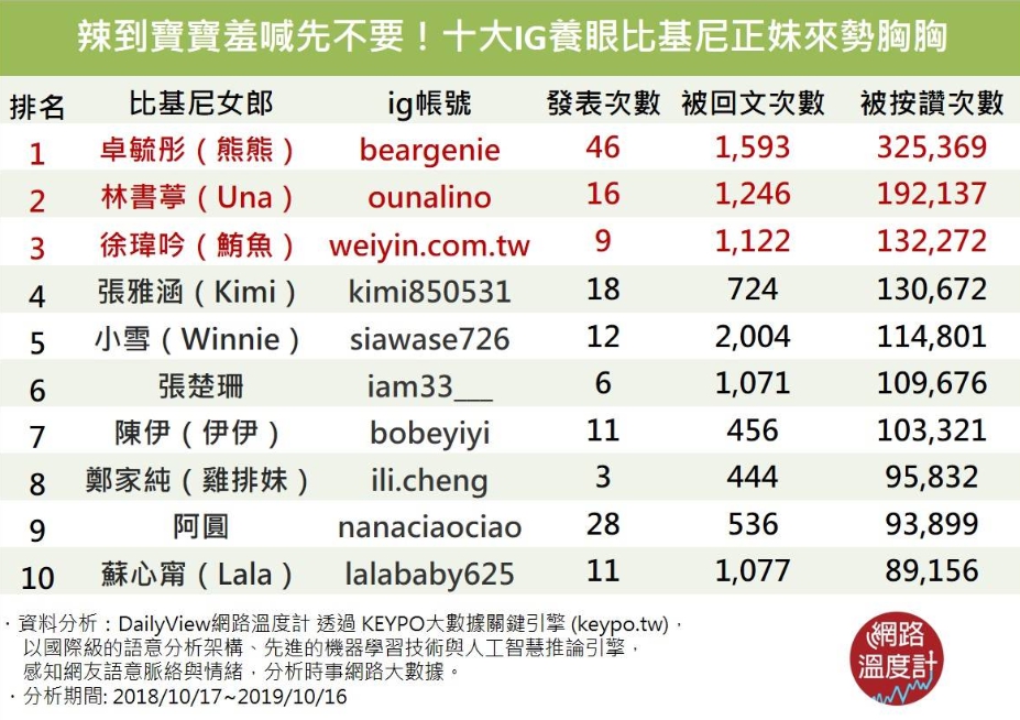 個性大方、自然不做作的陳伊,經常在社群平台分享美照,其中也不乏泳裝比基尼,陳伊燦爛的笑容加上性感比基尼,可說是甜美與魅惑兼具,因此貼文篇篇破萬讚,更入選「網路溫度計」的「十大IG比基尼正妹」,一舉獲得第七名,和眾多女星比拚絲毫不遜色!