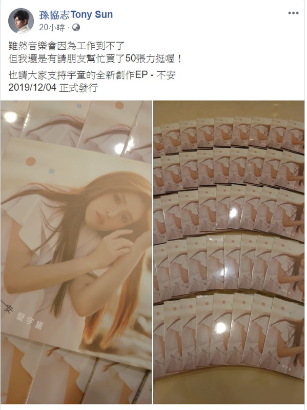 夏宇彤睽違11年再發片,最近也開始宣傳新EP《不安》,前幾天也舉辦了「不安的11音樂會」替首張創作EP暖暖身!而「好朋友」孫協志最近則在個人臉書發文並曬出50張夏宇彤新EP,我們從照片中可以看到,他把50張EP整齊排開,還寫道,「雖然音樂會因工作到不了,但我還有請朋友幫忙買了50張力挺喔!」透過行動來表示支持,並希望大家支持新EP。