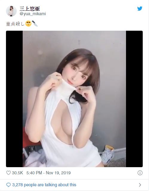 雖然行程相當忙碌,但是三上悠亞也不忘粉絲。19日時,三上悠亞在推特上PO出一段影片,表示自己穿著連處男都想「脫處」的「童貞殺」戰袍。也許是因為天氣轉冷的關係,三上悠亞穿著一件高領的毛衣,但這件毛衣的設計卻十分火辣,讓粉絲直呼「受不了」!