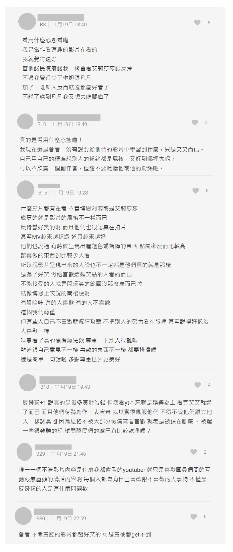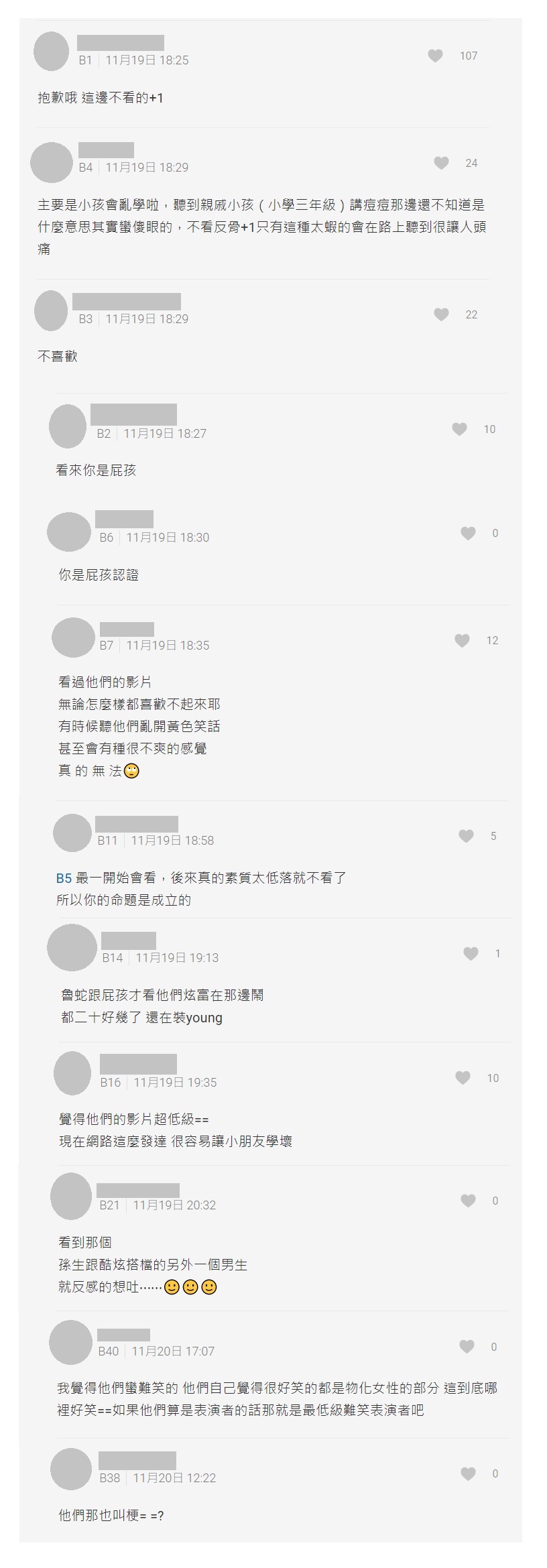 沒有過多的長篇大論,該名網友僅以一段文字闡述了自己對於「反骨男孩」的喜愛,更拋出了自己心中的疑問。然而,這樣充滿情感的內容,似乎無法扭轉那些不喜愛「反骨男孩」網友的想法,許多網友紛紛現身留言直嗆「看來你是屁孩」「你是屁孩認證」「魯蛇跟屁孩才看他們炫富在那邊鬧」,另外也有不少網友提出更深切的看法「主要是小孩會亂學啦」「現在網路這麼發達,很容易讓小朋友學壞」「他們自己覺得很好笑的都是物化女性的部分,這到底哪裡好笑」。