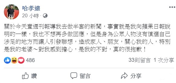 哈孝遠同時也指出,「身為公眾人物,沒有慎選自己涉足的地方,讓人引發聯想,造成家人、朋友,關心我的人,特別是我的老婆,對我感到擔心,是我的不對,真的很抱歉!」坦言自己這次的行為的確不妥,「我忽略現在我是公眾人物、藝人,但我就是很單純去找我哥哥、好朋友。」事後也緊急把臉書關閉。