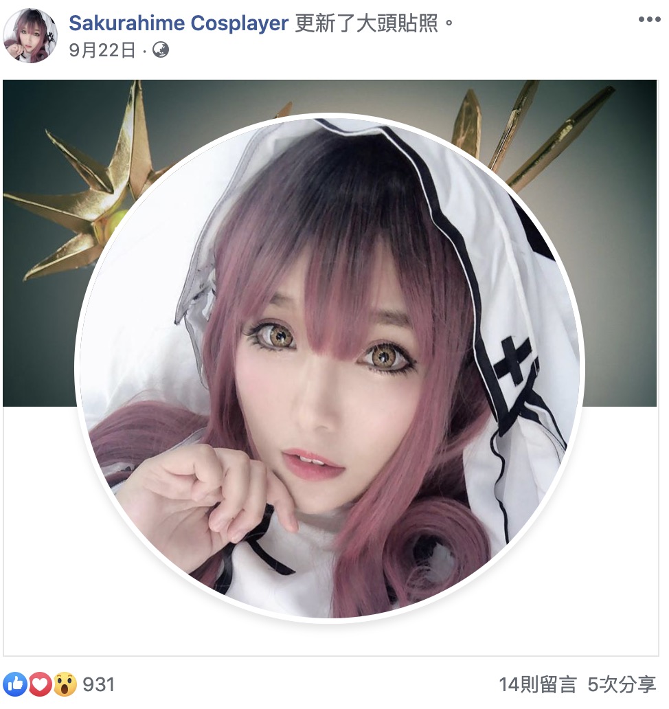 在9月22號重啟臉書後,櫻姬也發出許多cosplay的照片,其中在萬聖節當天她也曬出福利照,身穿一件胸前挖空的小背心,由上往下拍的視角令網友們看得臉紅心跳,傲人的好身材一覽無遺。