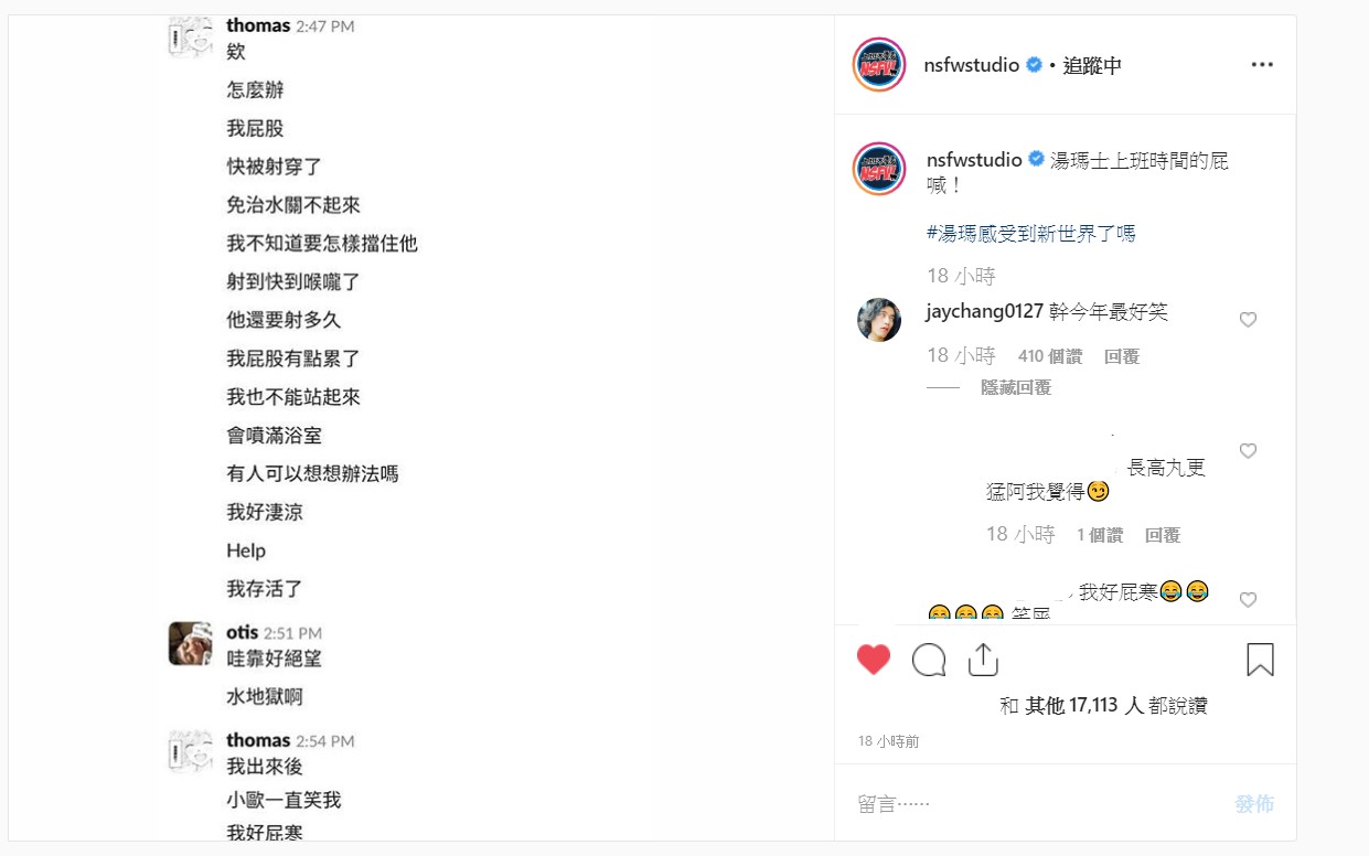 日前,「上班不要看」在IG曬出一則對話截圖,照片中可以看到成員湯瑪士和小歐兩人的對話,當時湯瑪士在使用免治馬桶,卻發現沖屁股的水柱關不起來,向同事們不斷呼救「怎麼辦,我屁股,快被射穿了,免治水關不起來,我不知道要怎麼擋住他。」字裡行間看出湯瑪士對於免治馬桶水流不止感到焦慮,他對此也形容「他還要射多久,我屁股有點累了,我也不能站起來,會噴滿浴室。」沒想到湯瑪士苦苦的哀求,卻遭同事小歐嘲諷回應「哇靠好絕望!水地獄啊!」。