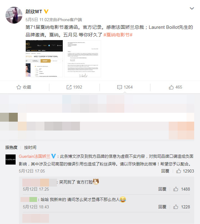 而當時趙欣在出發影展前還在微博上曬出電影節的邀請函,發文表達對邀請方的感謝:「感謝法國嬌蘭(Guerlain)總裁;Laurent Boillot先生的品牌邀請。」,但隨後也被嬌蘭的官方微博在留言區中留言否認,瞬間引起熱議。除了她在影展上露點的行為惹議之外,趙欣在微博上的簡介寫著「90後的我 因喜歡而選擇」,聲稱自己是1990年出生的,但她在紅毯上成熟的妝容讓許多網友對於她的年紀感到困惑,很難讓人第一時間聯想到她是只有28歲的輕熟女,然而在她的微博上卸掉濃妝的模樣看上去逆齡了許多,私底下的生活照也較為樸實簡單,和紅毯上的形象相差許多。