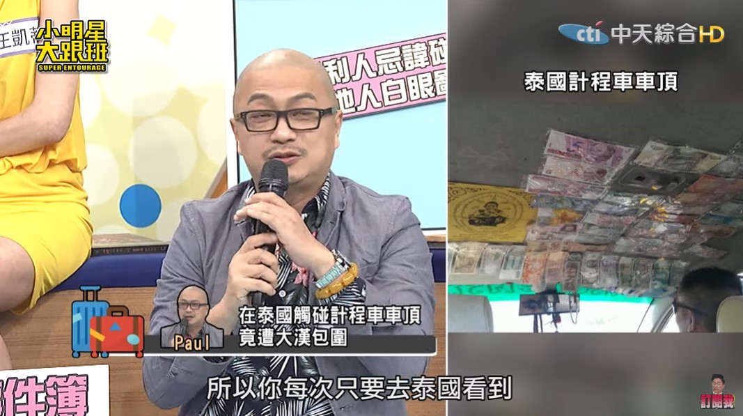 後來Paul才得知,原來在泰國當地經營計程車事業算是「高檔投資」,當地的司機都會請認識的佛教高僧,在自己的計程車車頂加持,而Paul拍車頂的行為,等於是把高增的祝福給拍掉了,所以才會惹怒當地司機。Paul也特別補充,有些泰國計程車內的車頂,會貼滿各國錢幣,這也是代表祝福與加持,提醒觀眾在搭乘時不要隨意觸碰。