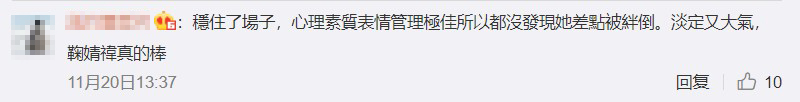 鞠婧禕機靈的臨場反應,並能迅速反應過來,讓網友們大讚:「業務能力太優秀了」、「優秀的水平,表情管理絕了」,也有網友對於將重點放到了鞠婧禕纖細的腿上,直呼:「腿好好看阿,我注意力全在這個上。」