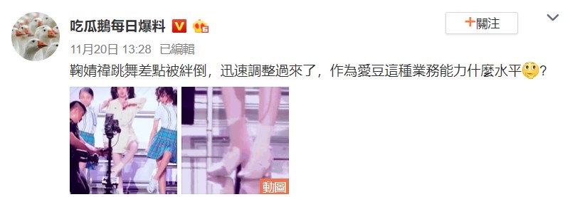 出身於四川的大陸藝人鞠婧禕,在單飛後拍攝許多戲劇如《九州天空城》、《芸汐傳》。以偶像女團出身她,奠定出扎實的舞蹈歌唱功力。近日根據陸媒報導,鞠婧禕在表演過程中,因為穿著高跟鞋熱舞,加上舞台上間隙,不慎在走位當中絆到自己腳,險些跌倒,而有著豐富舞台經驗的她,臉部表情完全沒有受到影響,並快速調整節奏,迅速步入正軌,臨危不亂的反應讓網友們紛紛大讚。